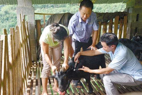 村民田玉华在海洋乡畜牧兽医站技术人员指导下学习山羊防疫技术