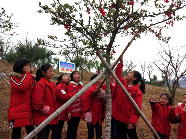 青峰小学废弃地约有8亩,2015年青峰镇镇政府、林业站为青峰小学捐赠了五十余株树苗。桃树、梨树、海棠树、石榴树等,顿时伴靓了整个百果园,也使以前仅有的橘树有了“新伴”,让青峰小学校园春有花,夏有荫,秋有果,冬有景。同时,改校还将更好利用“百果园”,对它们进行科学规划,划分给高年级每个班级,学生们定期劳动,自主经营。春天时师生们共同欣赏各式各样的花,秋天共同享受“百果园”的果实,定期让技术指导老师给学生们上课,让他们了解树木嫁接、修剪树枝等知识,大大地带动了学生们的热情。相信,在全体师生们的共同努力下,“百果园”基地也会成为该校开展“综合实践课程”的又一重要场所。