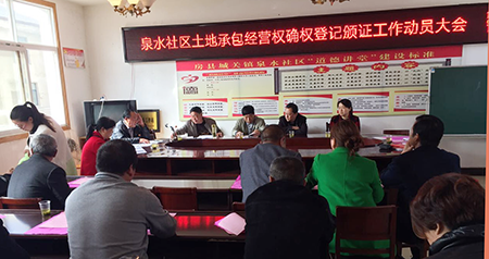 房县新闻网讯 通讯员 况艳平 报道:为确保按时间节点,高质量、高标准完成2017年农民土地确权工作,4月10日,城关镇泉水村组织召开泉水社区土地承包经营权确权登记颁证工作动员大会,向群众代表讲解“确权”的现实意义、农村土地承包经营权确权登记颁证工作相关要求及操作规范等,并就工作中可能出现的重点问题进行了解答。