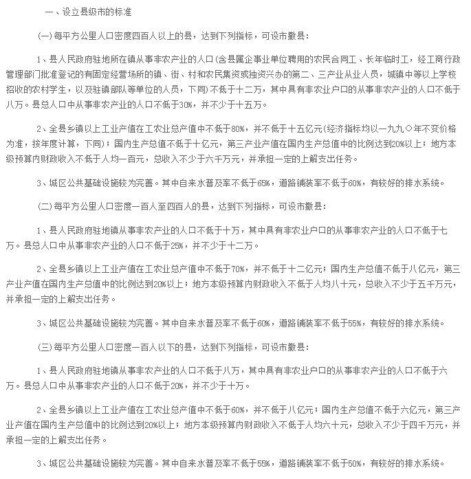 说起来这项改革由来已久,1986年国务院转批民政部《关于调整设市标准和市领导县条件的报告》规定:非农业人口6万以上,年国民生产总值2亿元以上,已成为该地经济中心的镇,可以设置市的建制。1993年国务院转批民政部《关于调整设市标准的报告》对撤县设市有了更详细的标准,包含了人口、GDP、财政收入等众多指标。