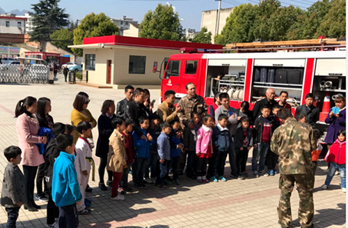 消防官兵向同学们详细介绍了消防器材的使用、灭火的方法以及在火灾中如何自救、互救等知识,展示了消防衣、防蜂衣的穿着,并向孩子们讲解在车祸及一些救助现场,应该准备的各种装备。官兵们敏捷的身手、迅速的反应,让小朋友们惊叹不已,情不自禁的鼓起了掌,大声称赞消防员叔叔真厉害,真勇敢!孩子们觉得不过瘾,纷纷举手想要体验,消防官兵给孩子们穿上战斗服戴上消防头盔,让孩子们做一回“小小消防员”。