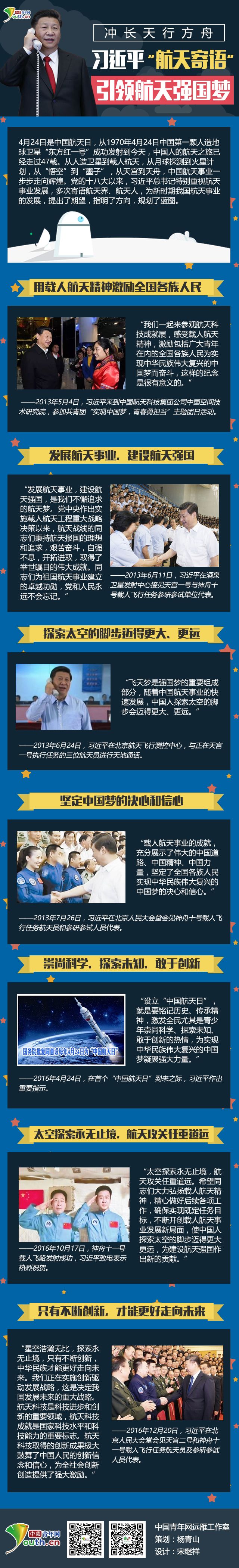 中国青年网北京4月24日电(记者 杨青山)4月24日是中国航天日,从1970年4月24日中国第一颗人造地球卫星“东方红一号”成功发射到今天,中国人的航天之旅已经走过47载。从人造卫星到载人航天,从月球探测到火星计划,从“悟空”到“墨子”,从天宫到天舟,中国航天事业一步步走向辉煌。党的十八大以来,习近平总书记特别重视航天事业发展,多次寄语航天界、航天人,为新时期我国航天事业的发展,提出了期望,指明了方向,规划了蓝图。