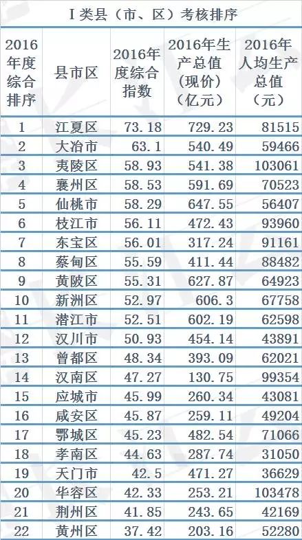 2016年Ⅰ类县(市、区)实现生产总值9152.38亿元,有15个区市GDP过300亿元,8个过500亿元,其中,江夏区、仙桃市、黄陂区、新洲区、潜江市过600亿元。