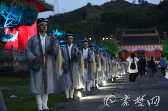 第四届国际道教论坛10日在武当山开幕。9日晚,开幕式暨文艺演出举行预演。演员们带妆进行最后一次综合彩排。在山门到龙虎殿之间,道路两旁间隔设置道士迎宾队列,辅以武当道乐风格的哼鸣与合唱。记者 张建波 张启国 摄