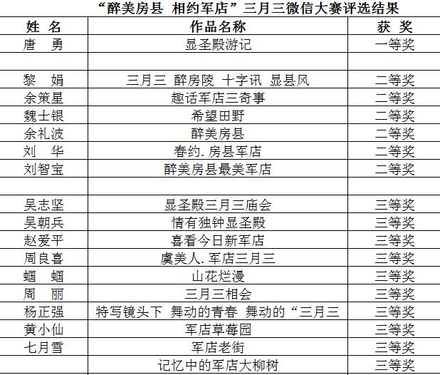 本次大赛是由房县县委宣传部、房县旅游局、房县文联、房县军店镇人民政府、房县广播电视台联合举办的“醉美房县 相约军店”三月三微信大赛。从3月28日开始,截止到4月24日,微信大赛组委会收到了来自全县各地的200多幅参赛作品,这些作品都有着浓浓的地域特色。或文笔流畅,语言优美,展示了房县悠久的历史文化和优美的人文景观;或图案构思新颖、整洁清晰、色彩鲜明靓丽,有较好的视觉效果。经初选共有30幅作品入围,这些作品都在第一时间通过房县新闻网和房县新闻网微信公众号进行了刊载,受到广大网友、微友的热情支持。