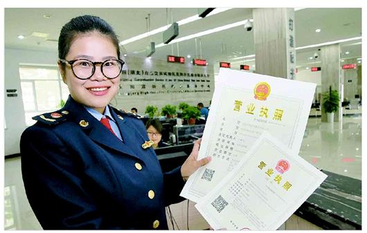 楚天都市报讯(记者 陈希 通讯员 詹清贵)昨日上午,在湖北省自贸试验区襄阳片区政务服务中心,湖北带路商贸物流有限公司法定代表人王林林领取了全省首张“九证合一”营业执照。