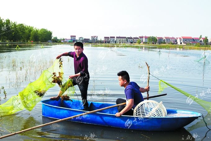 在荆州沙岗镇,工作人员划着小船在湖里捞虾。