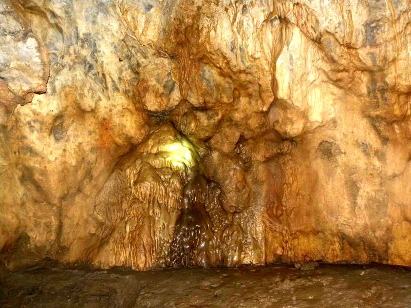 山洞内,脚下是流水,头上是沁水,两旁是淤积的泥巴,只有手电光所照的钟乳石上才看得到几处钟乳奇观,似佛、如仙,石帘,石乳。形态各一,没有遭到人为的破坏。