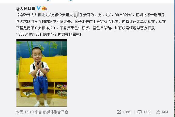 与此同时,新浪微博“平安房县”得知男童走失一事后,马上通过微博发布寻人线索,希望更多网友转发,提供信息。而房县公安局刑侦大队民警也将男童走失事宜发布在公安部儿童失踪信息紧急平台上,随后,包括公安部儿童失踪信息紧急平台、人民日报、十堰晚报等在内的多个微博也对此事件进行了转发,越来越多的网友通过自己的力量传递着爱心。