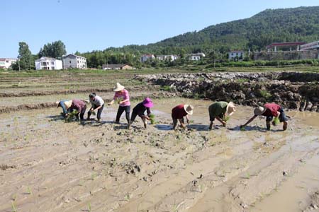 27日,土城镇穿山堰村三组的村民们正在合作社的秧田里栽植有机稻。今年,土城镇与庐陵王酒业有限公司签订有机稻谷种植收购协议,在土城镇白鸡、穿山、葛坪、塘埂4个村种植绿色无公害有机稻谷共计1200余亩,采用公司+基地+合作社+贫困户的模式进行种植。通过以上措施确保村集体经济收入和贫困户增收实现双赢,为村出列户脱贫奠定坚实基础。