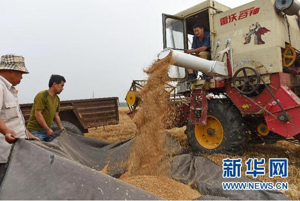 6月2日,河北省巨鹿县柳林村的农民在收获小麦。近期,河北省小麦由南至北陆续成熟,农民开始适时收割小麦。据了解,2017年河北省小麦收获面积预计达3400多万亩。 新华社记者 杨世尧摄