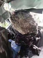 大约8时50分许,山上开始不断有小石子掉落,砸在车身上发出“嘭嘭”的声响,司机不断打方向盘避让。突然间,一块直径两三米的大石从天而降,只听一声巨响,驾驶室一侧的前挡风玻璃被砸穿。客车猛地一顿,接着向左急转。王大爷向前一栽,头部撞在驾驶座的靠背上,顿时晕头转向。