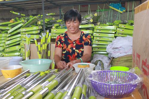 拖把杆的打孔、成品的组装,不需要多少技术,劳动强度小;以件计酬,可以让工人有充分的工作时间自由。这让用工门槛大大降低,同等生产力下,宦熊优先雇用贫困户,让他们每月有1500元至2500元左右的收入。