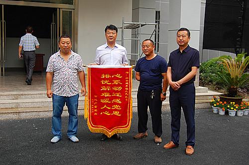 图为拆迁户雷爱兵送政府锦旗表谢意
