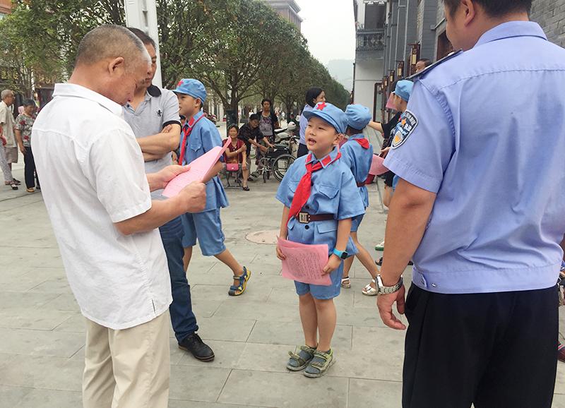 早上七点,由10名城管队员带领小民兵们来到玉虚街开展“小手牵大手,共创文明和谐武当”活动。