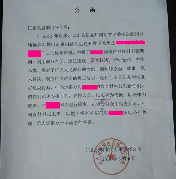 打着反腐旗号,借着“反腐公司”授权,携带伪造“举报信”、“调查函”、“隔离审查通知书”,到村委会“走访调查”,找村干部“谈话”,声称可以“摆平”相关问题。7月19日,湖北京山警方向澎湃新闻通报,犯罪嫌疑人陈某打着“反腐倡廉”幌子招摇撞骗,已被予以治安拘留处罚。